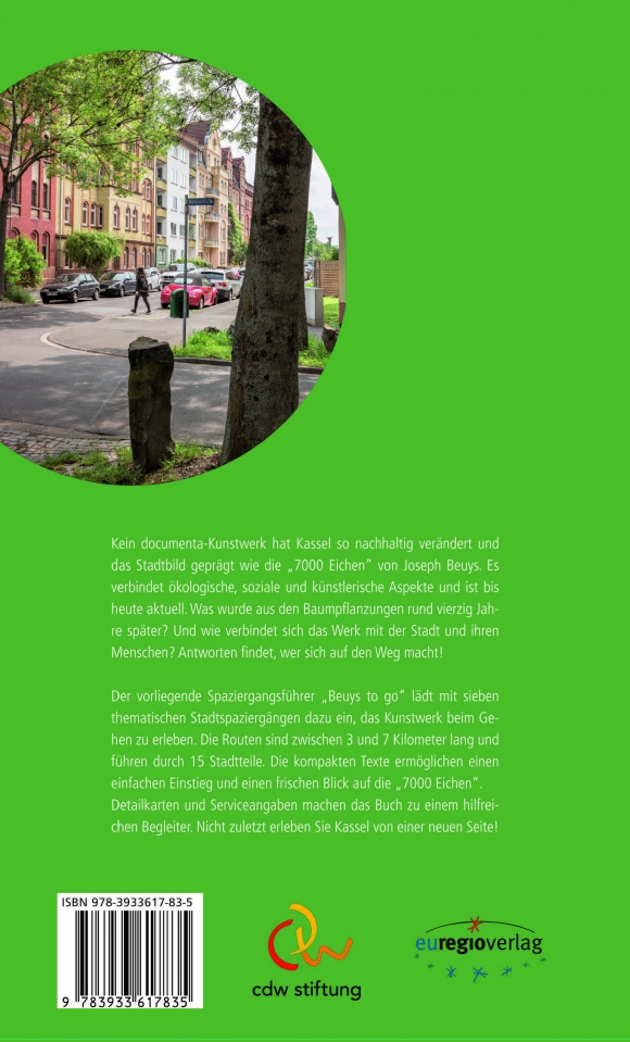 „Beuys to go“! Mit fundierten und lesenswerten Texten, Fotos und Kartenausschnitten lädt der Wegbegleiter ein, auf den Spuren von 7000 Bäumen ein wohl einzigartiges Kunstwerk und zugleich eine ganze Stadt zu erkunden. Die sieben thematischen Routen führen durch 15 Stadtteile Kassels und sind zwischen drei und sieben Kilometer lang.