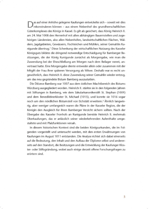 In diesem historischen Kontext sind die beiden Königsurkunden, die im Folgenden vorgestellt und untersucht werden, mit den ersten Erwähnungen von Kaufungen im August 1011 entstanden. Die Analyse richtet sich einerseits auf die Bedeutung, den Inhalt und den Aufbau der Diplome selbst und andererseits auf den Standort, die Besitzungen und die Entwicklung der Kaufunger Kloster- oder Stiftsgründung, wobei auch einige derzeit offene Forschungsfragen zu erörtern sind.