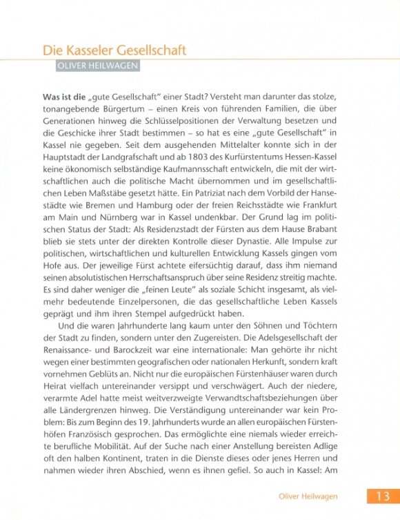 Aber das Leben in Kassel ist auch bestimmt von seiner Geschichte und seiner Kultur, und auch die kommen nicht zu kurz. Die Geschichte der Kasseler Gesellschaft (Oliver Heilwagen, freier Journalist), der Residenzstadt Kassel (Klaus Siebenhaar, Verleger) oder der tragischen Bombennacht im Oktober 1943 und deren Auswirkungen auf Kassel (Michael Stürmer, Journalist) fehlen genauso wenig wie die Entwicklung der Universität Kassel (Helmuth Schneider, Historiker, Uni Kassel) oder Kassel als Industriestandort (Claus Peter Müller von der Grün, Journalist).